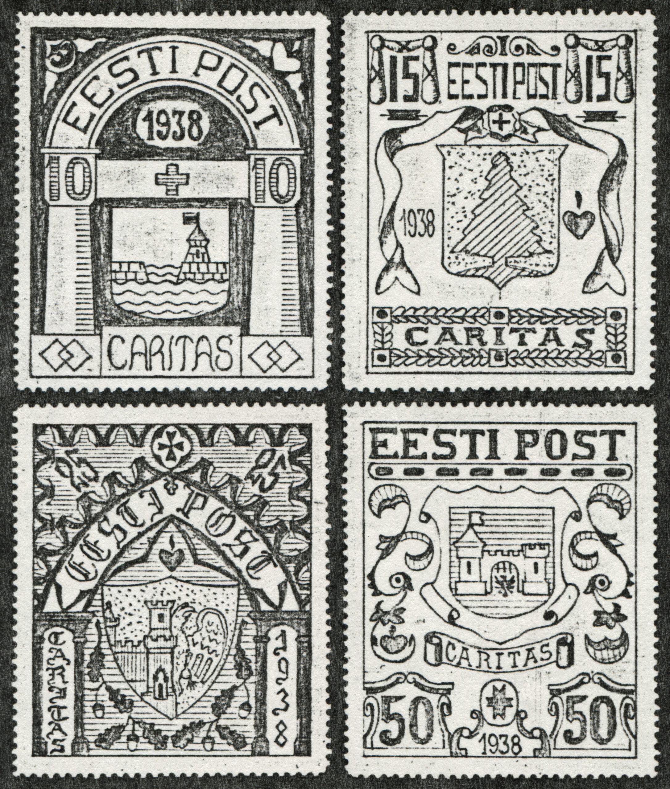Rahvusvahelise Margikogujate Seltsi ajakiri Estonia, nr 20/21, 20.05.1938, lk 1-2Caritas. Heategevusväljaanne Ühisabi heaks. Eesti linnade vapid. Kuressaare, Haapsalu, Paldiski ja Võru vapp. 21.01.1938, kujundanud Mihail Sidorov.