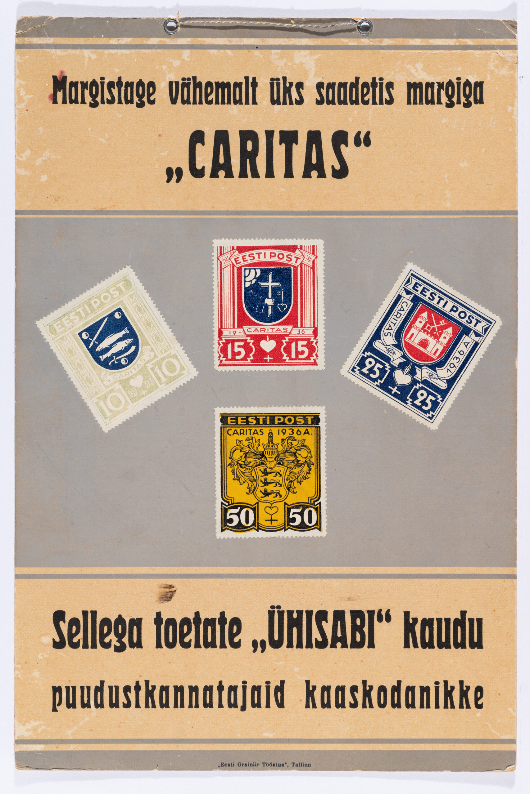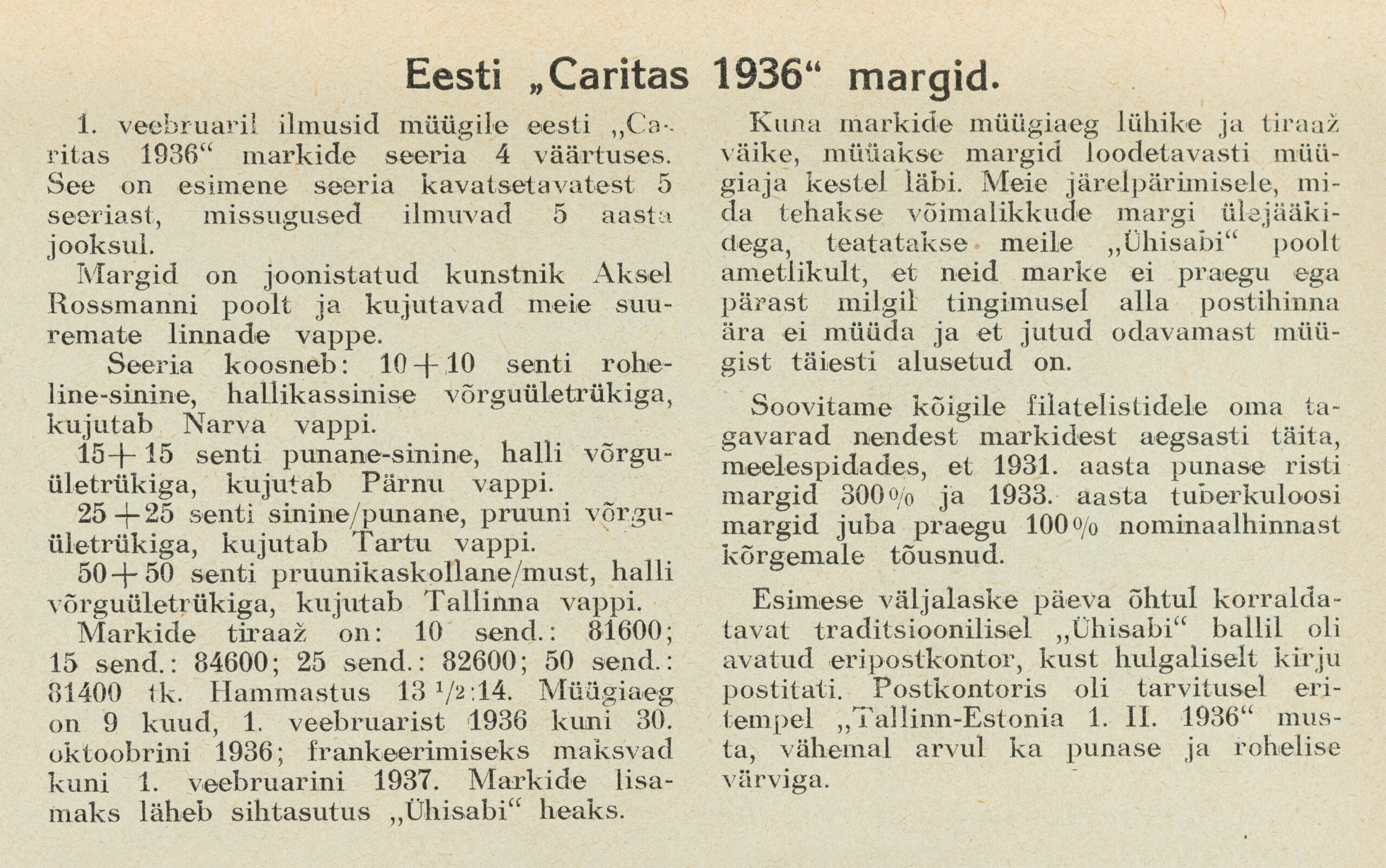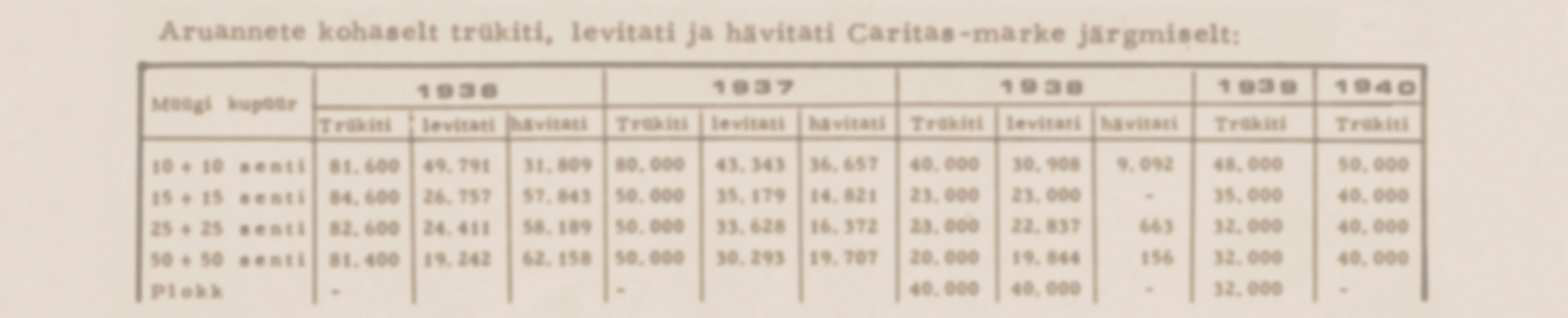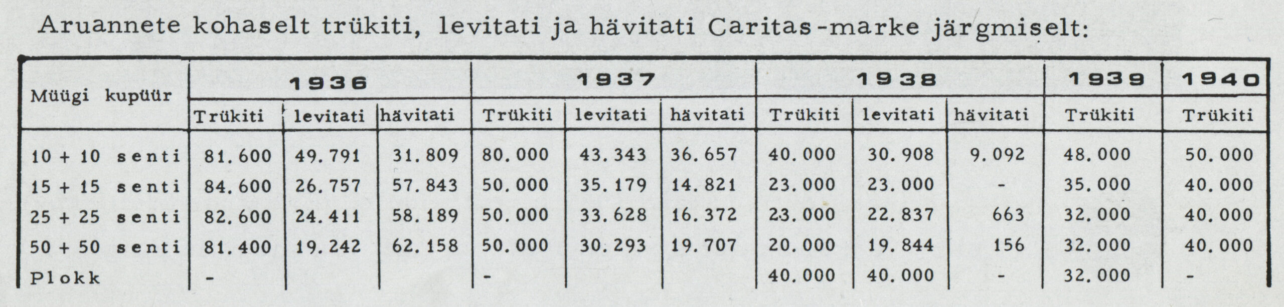 Caritas postmarke trükiti 1936. aastal 320 000 ja need olid maksvad kuni käesoleva aasta 1. veebruarini. Aasta jooksul saadi postmarkidest tulu üle 50 000 krooni, millest 50 % läheb kokkuleppe kohaselt riigile“.