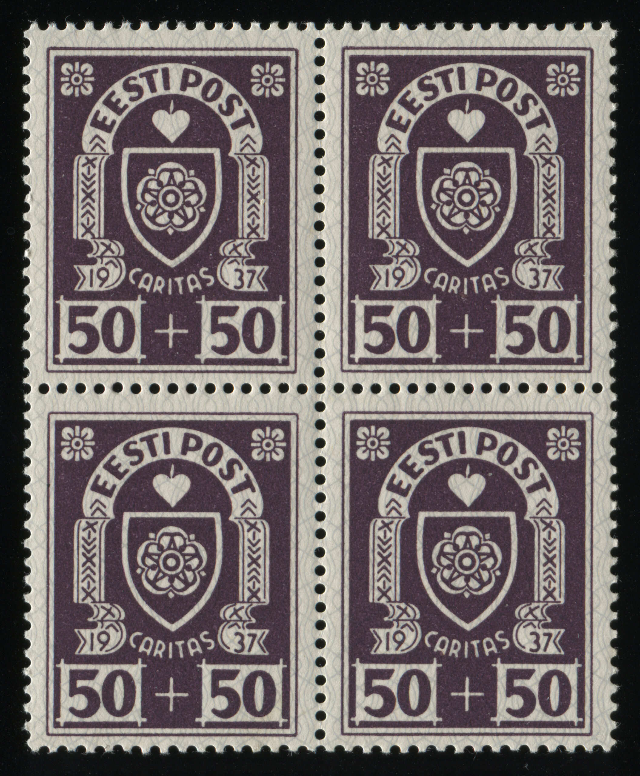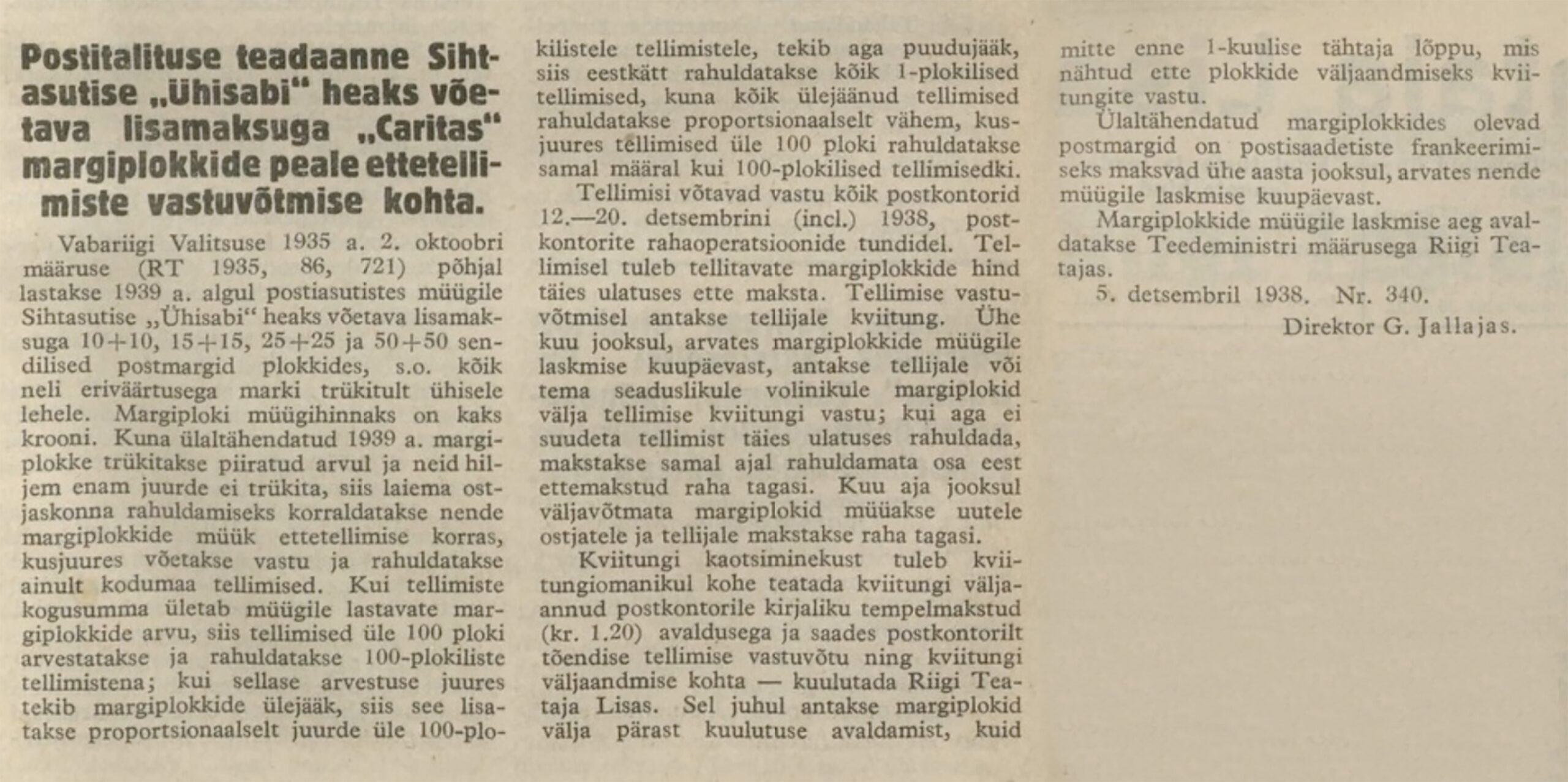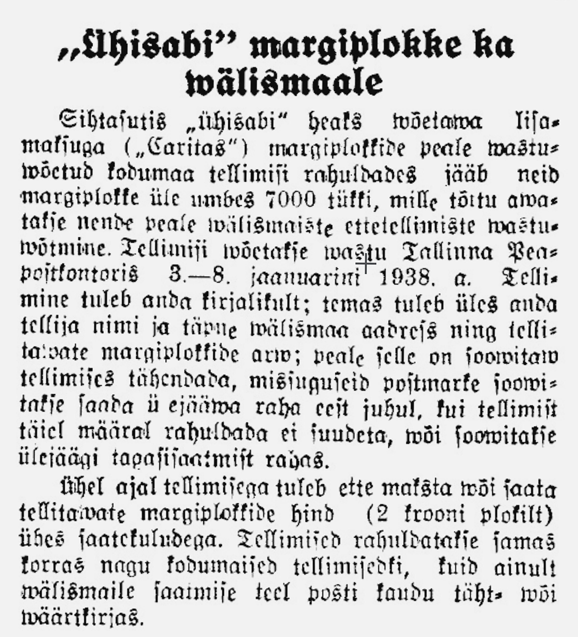 Caritas postmarke trükiti 1936. aastal 320 000 ja need olid maksvad kuni käesoleva aasta 1. veebruarini. Aasta jooksul saadi postmarkidest tulu üle 50 000 krooni, millest 50 % läheb kokkuleppe kohaselt riigile“.