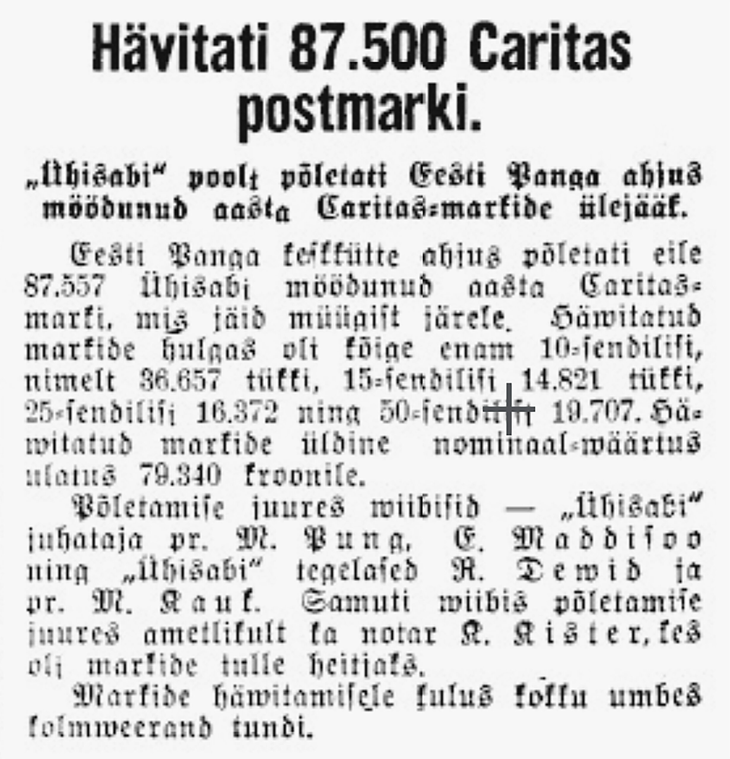 Eesti Panga ahjukütjate imestus oli suur, kui kütteruumi ilmusid äkki riigiametnikud. Siin on lõik ajalehest Uus Elu (nr 39,1937, lk 9): „Eesti Panga ahjukütjate suureks imestuseks kogunes kolmapäeva ennelõunat panga keskkütte ruumi kümmekond Tallinna tuntud seltskonnategelast ja kõrgemat riigiametnikku. Kokkutulnud olid „Ühisabi“ tähtsamad tegelased, kes olid tulnud põletama 1936. aasta müümata jäänud Caritas postmarke. Leekide ohvriks langes 209 999 erihinnalist postmarki. Müügist ülejäänud margid põletati põhjusel, et mitte rikkuda käesoleval aastal liikvele lastud Caritas markide turgu.