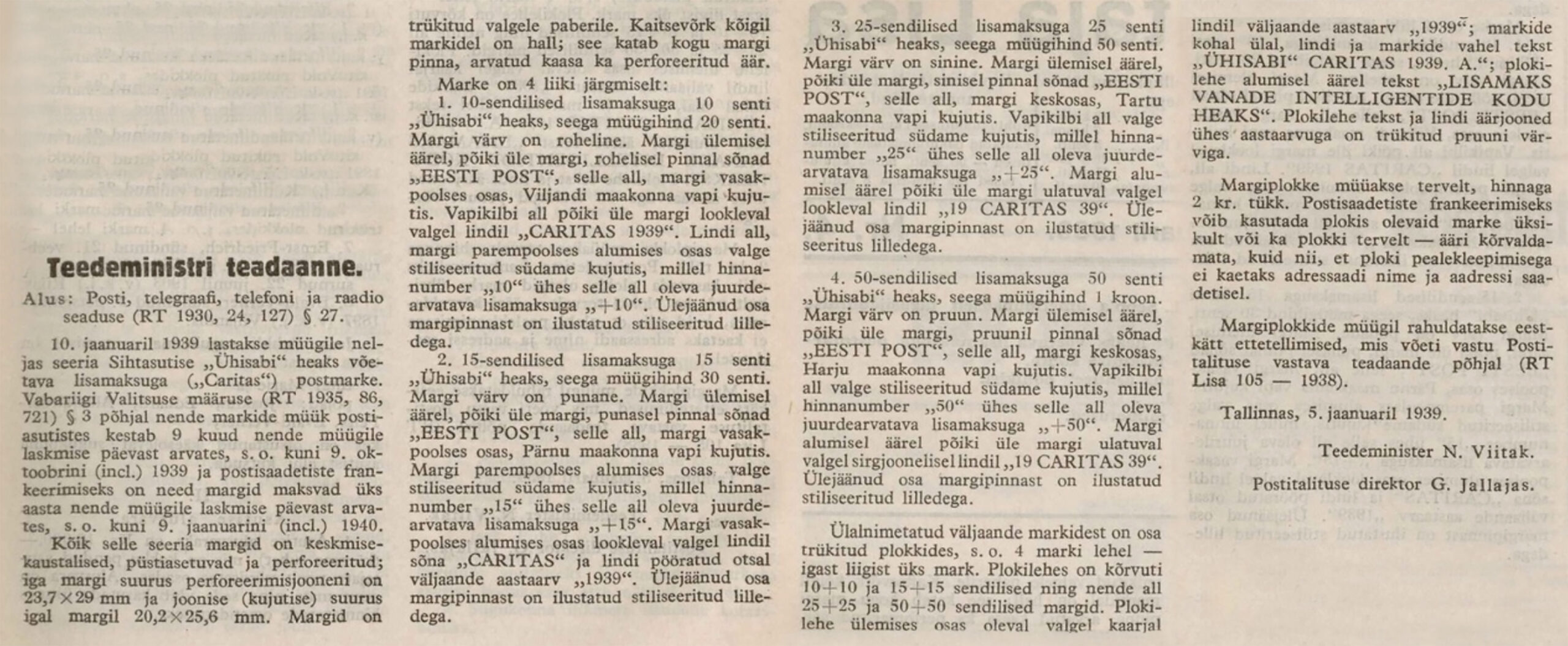 Margid olid müügil 10.01.–10.10.1939, postimaksevahendina kehtisid need kuni 10.01.1940.