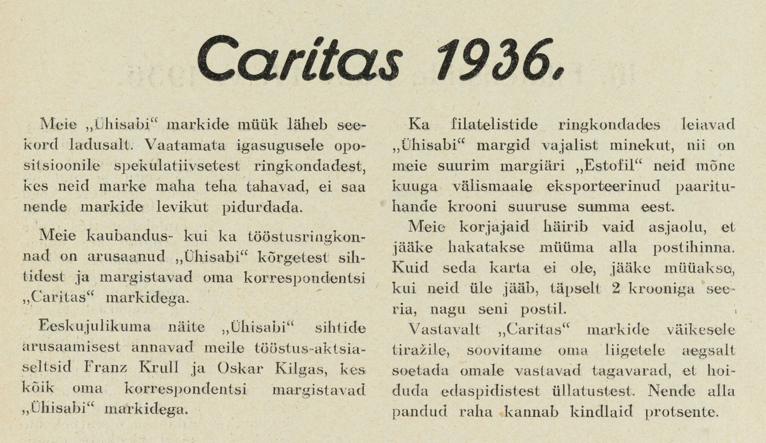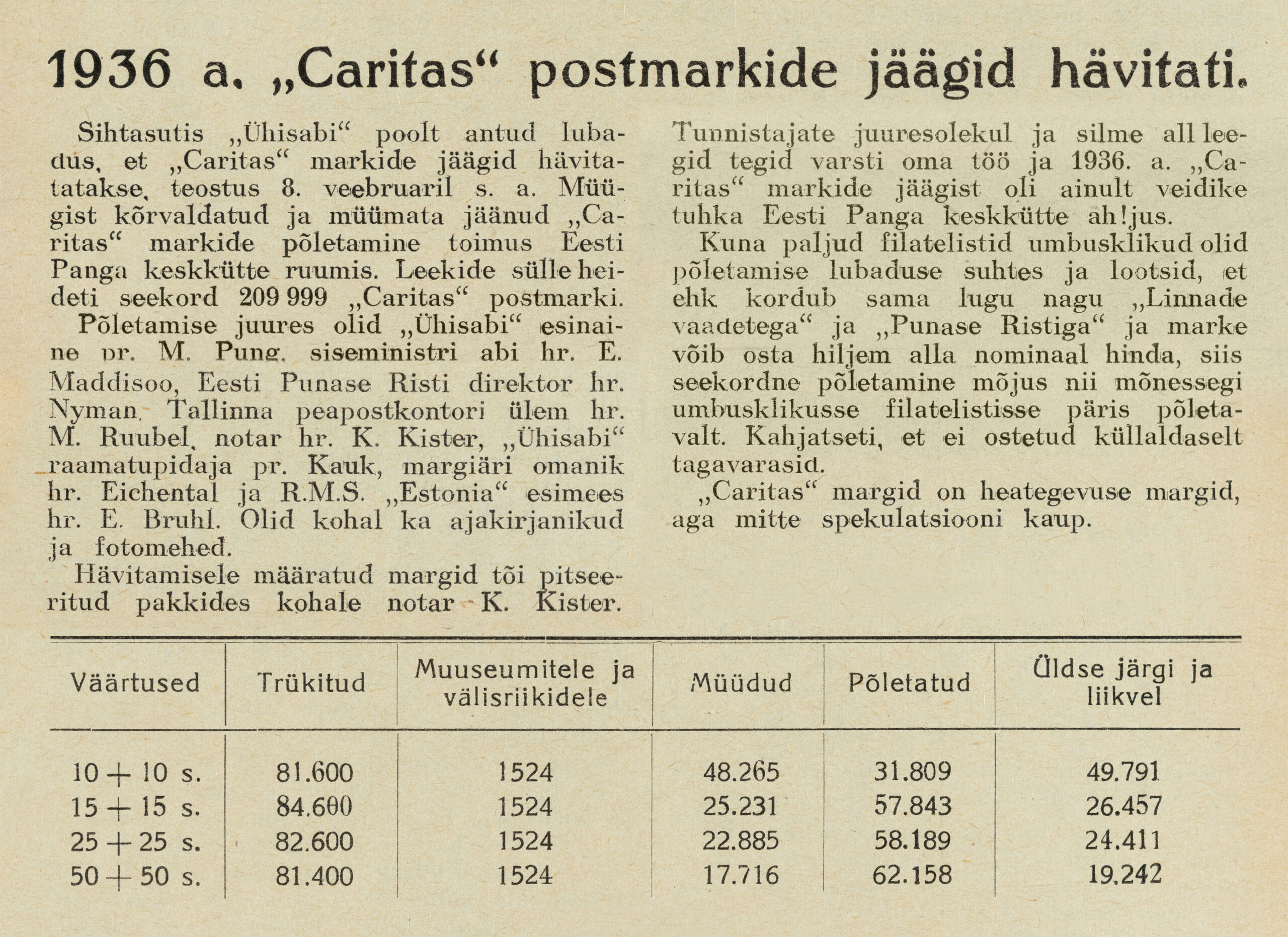Oktoobris 1936 tuli „Ühisabilt“ selline teade: „17. septembril s.a. Ühisabi koosolekul otsustati Caritas markide ülejääk ära hävitada. Sellega tahetakse hoida üleval Eesti postmargi head nime ja Caritas margi head edu. Viimane samm on tehtud eriti arvestades korjajate huvidega, kes suurel määral on marke ostnud ja kelle otsekohestes huvides on margi hinna püsimine. Peale nimetatu on Ühisabi saavutanud kokkuleppe Postivalitsusega selles, et järgmine seeria Caritas marke saab trükitud märksa vähemal hulgal. Esimest väärtust 80 000 marki ja järgmisi 50 000. Sellega saavad ära hoitud markide ülejäägid ja filatelistidele on kindlustatud markide ostuks väljaantud kulutused.“ (Rahvusvahelise margikogujate seltsi ajakiri Estonia nr 14, 20.10.1936, lk 9)