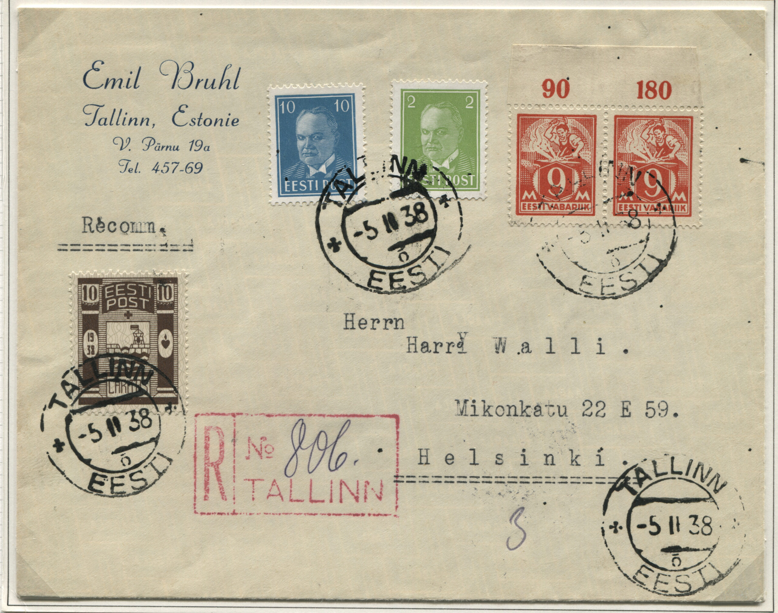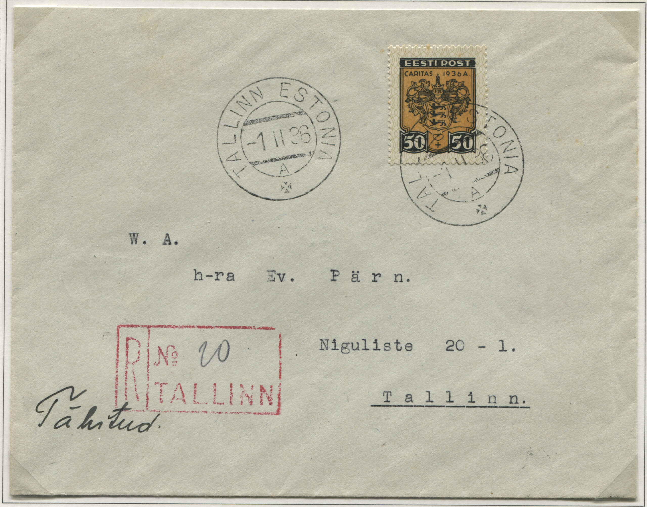 ERMi koguRahvusvahelise Margikogujate Seltsi ajakiri Estonia nr 12, 14.03.1936, lk 15Tähitud kiri, saadetud Tallinna 1.02.1936
