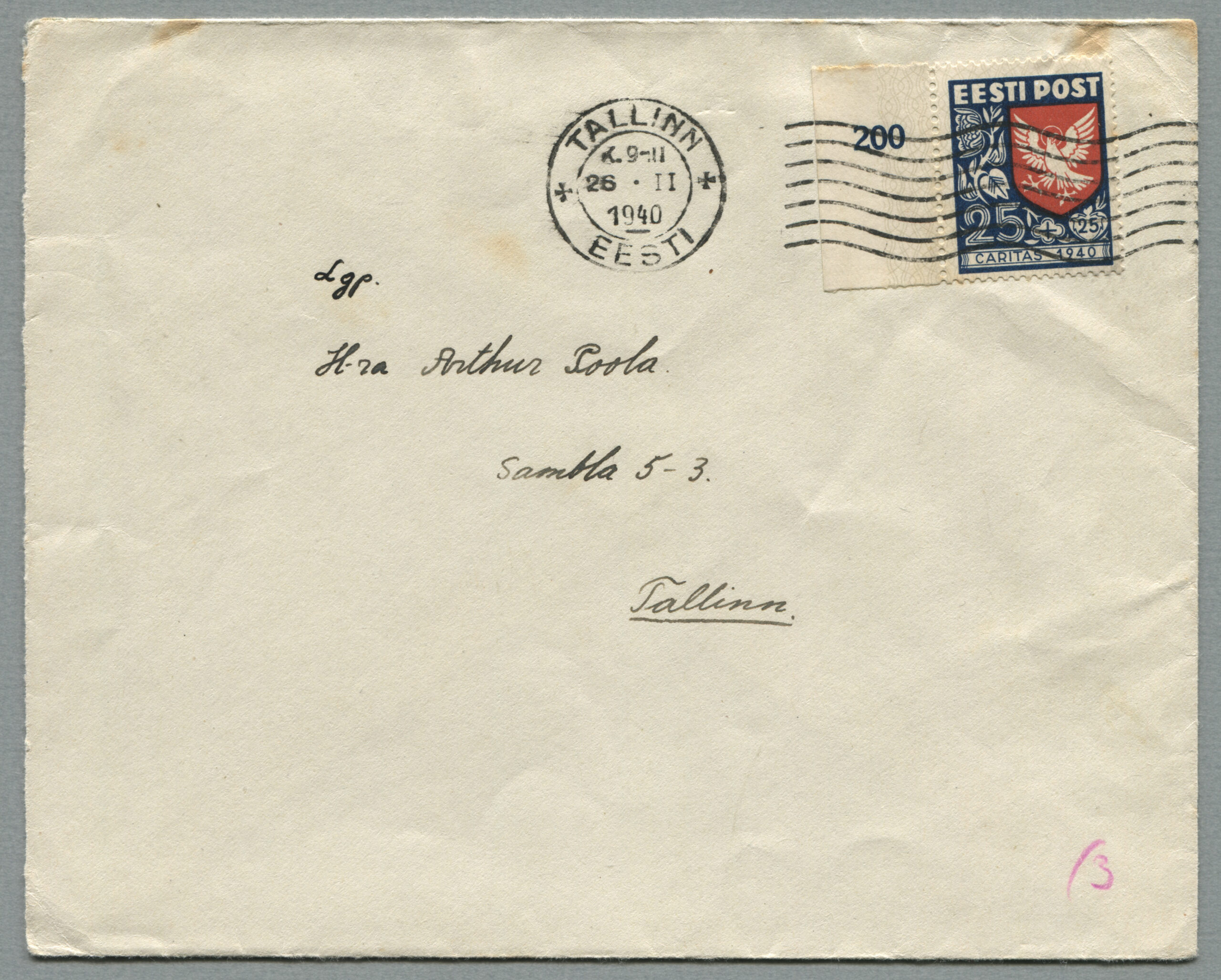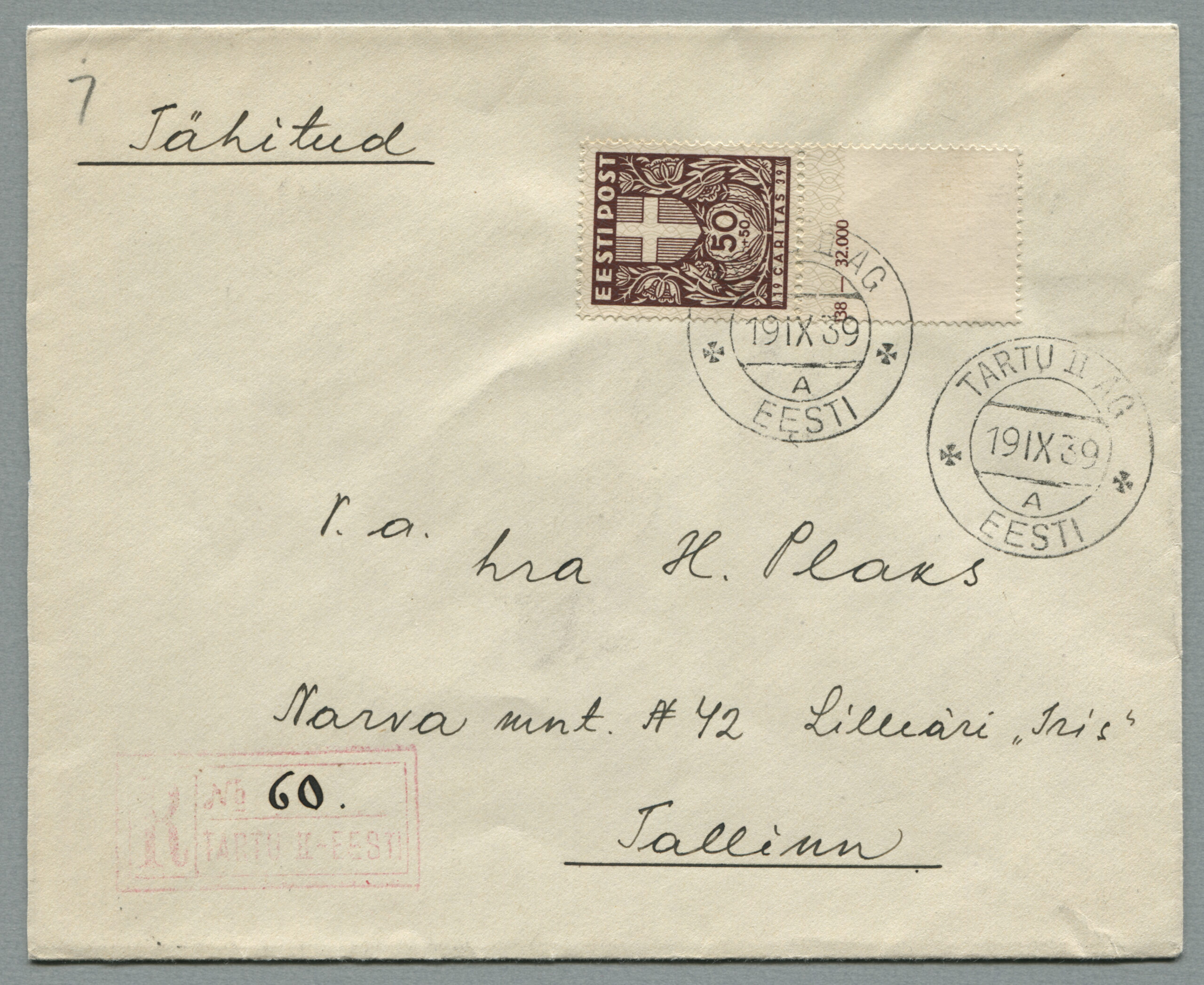 Tähitud kiri Tartust Tallinna, tempel „Tartu II AG, 19.09.1939“.