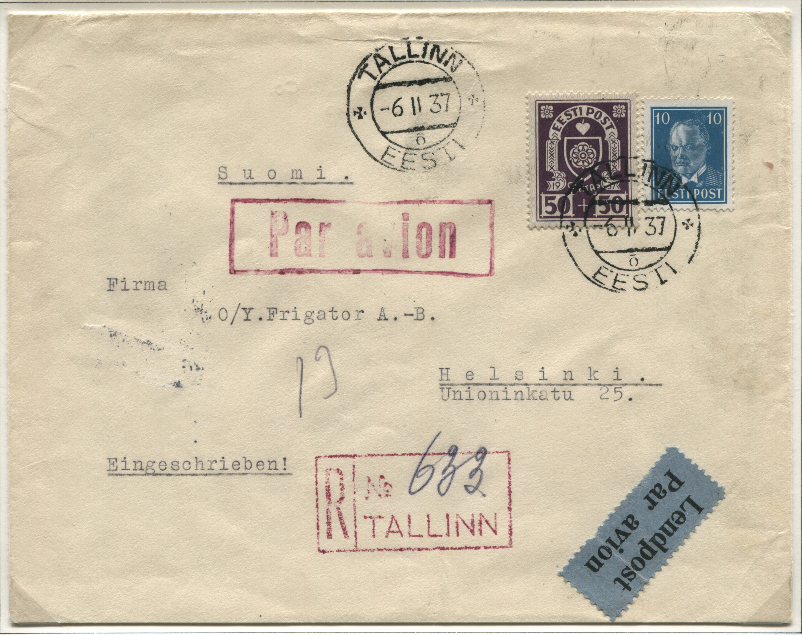 ERMi koguTähitud õhupostikiri Tallinnast 6.02.1937 Helsingisse 8.02.1937.