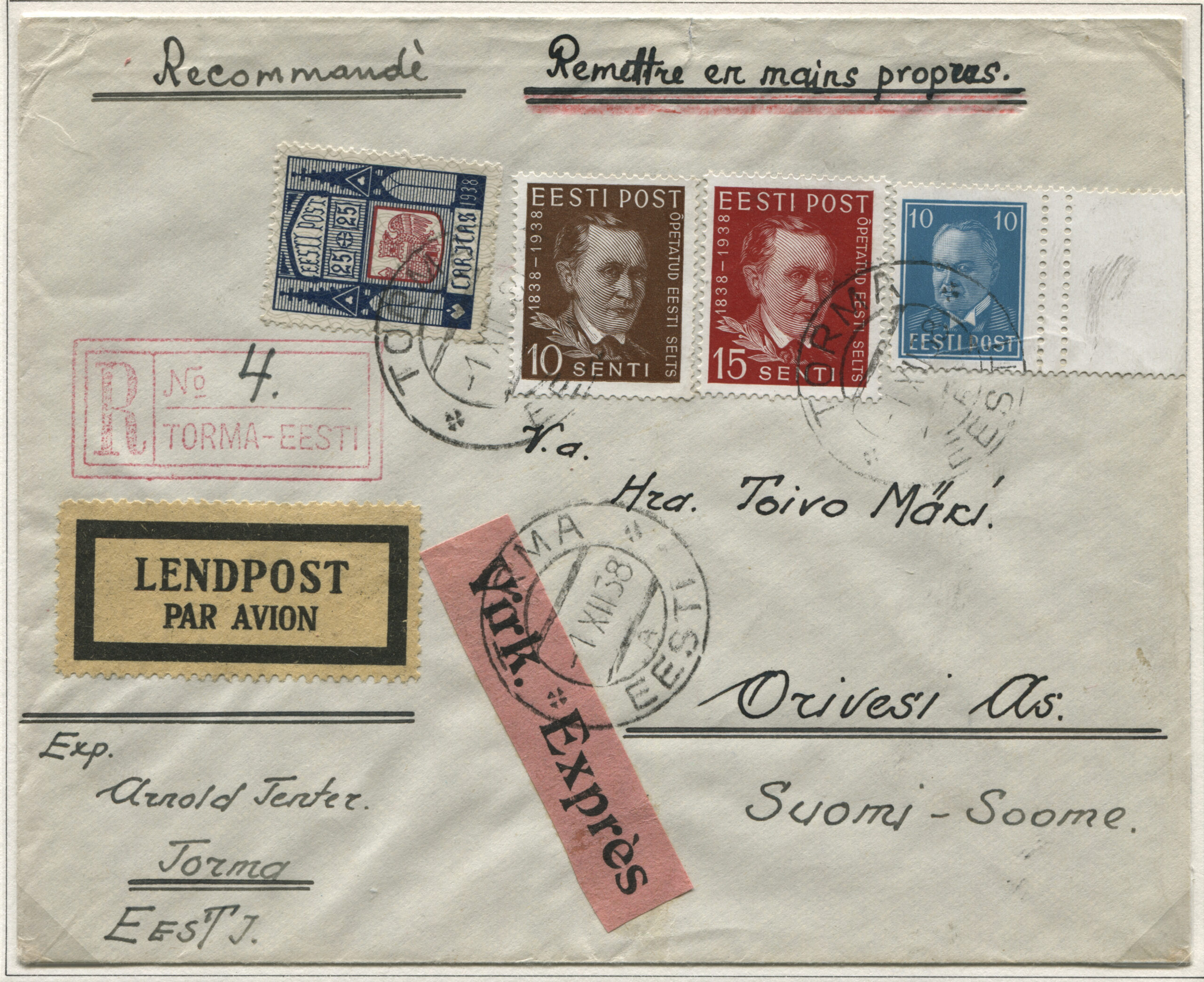 ErakoguTähitud lennuposti kiri Tormast 1.12.1938 Orivesile (Soome) 3.12.1938.