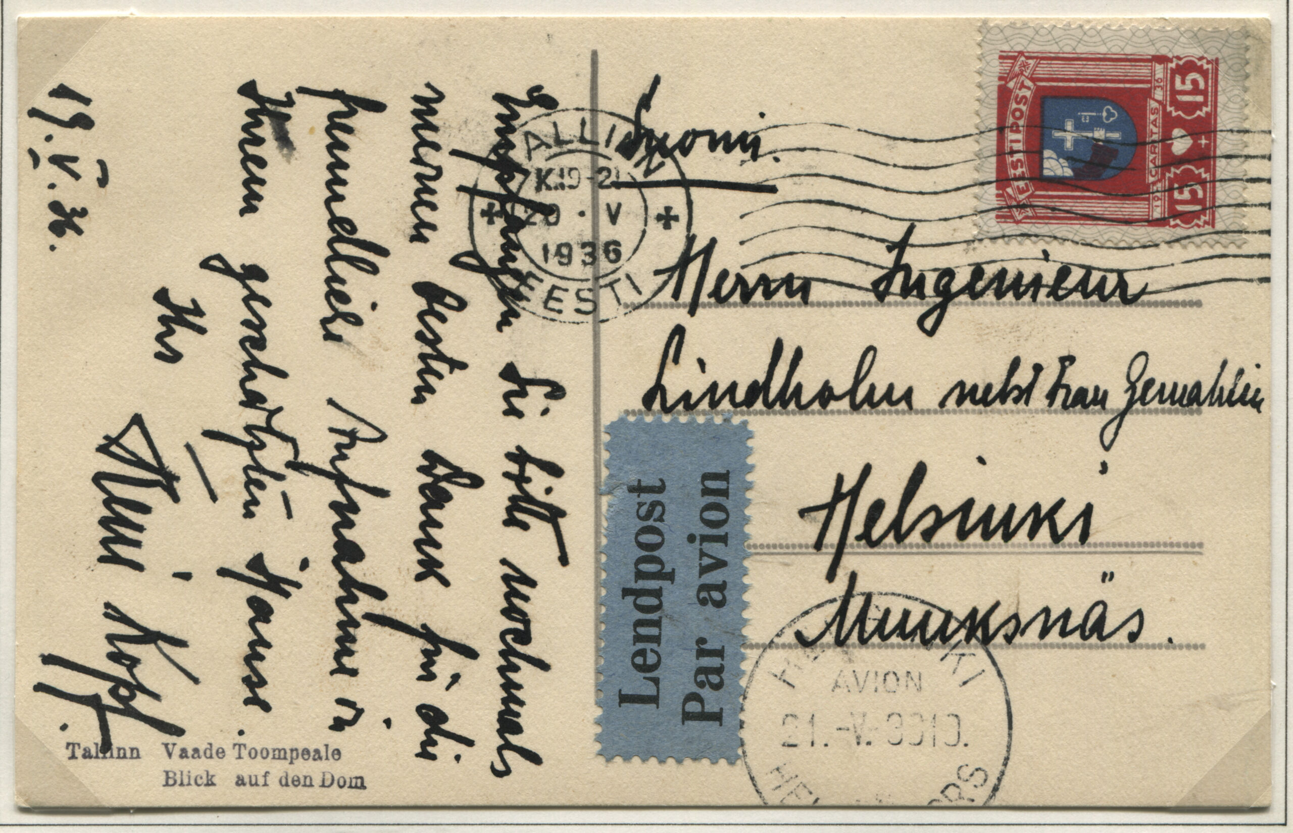 ERMi koguÕhupostikiri, saadetud Tallinnast 22.05.1936 Helsingisse 22.05.1936