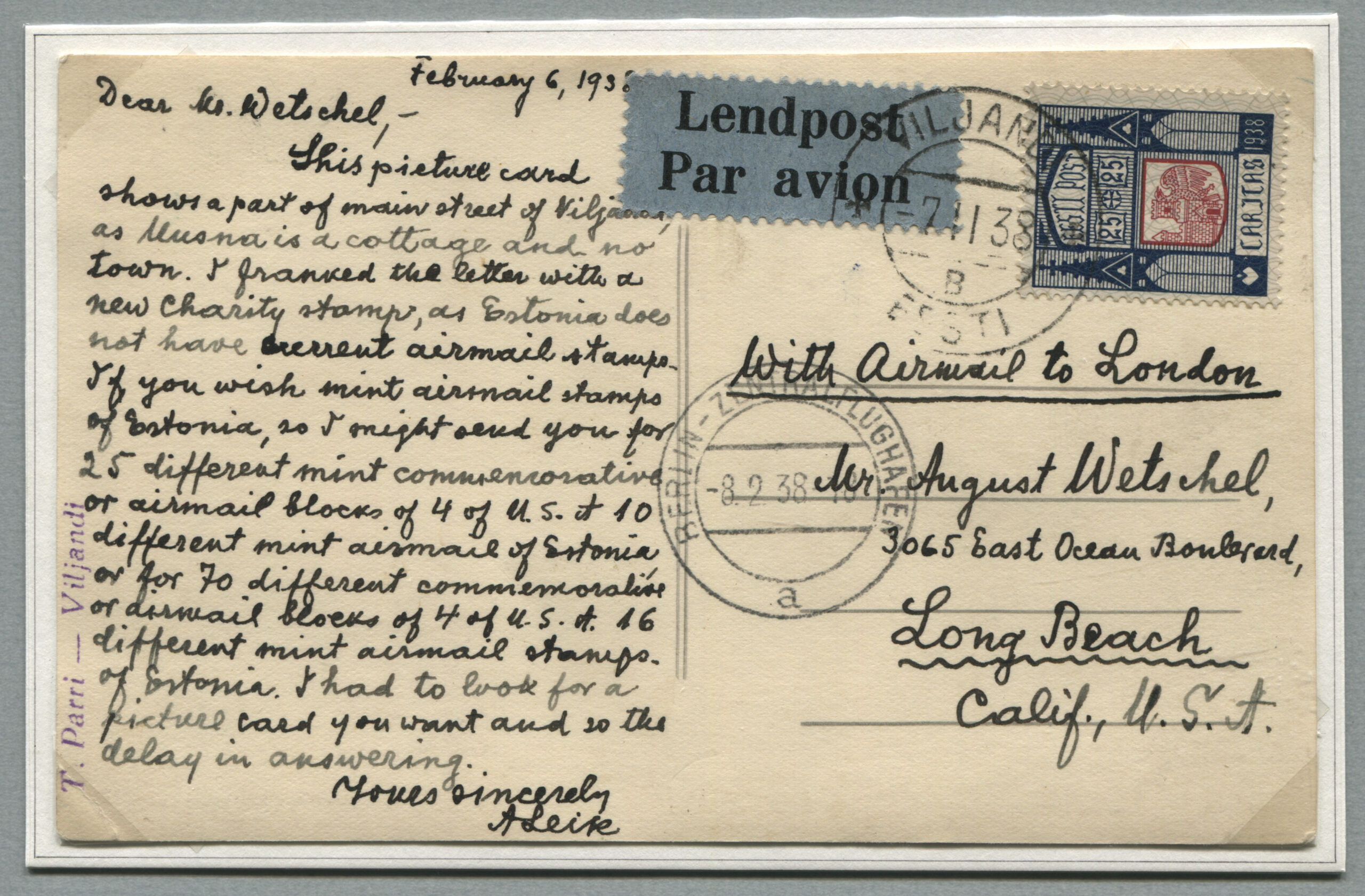 ERMi koguLennupostikiri, mis on saadetud Viljandist 7.02.1938 (Berliin 8.02.1938) Long Beachi (USA).