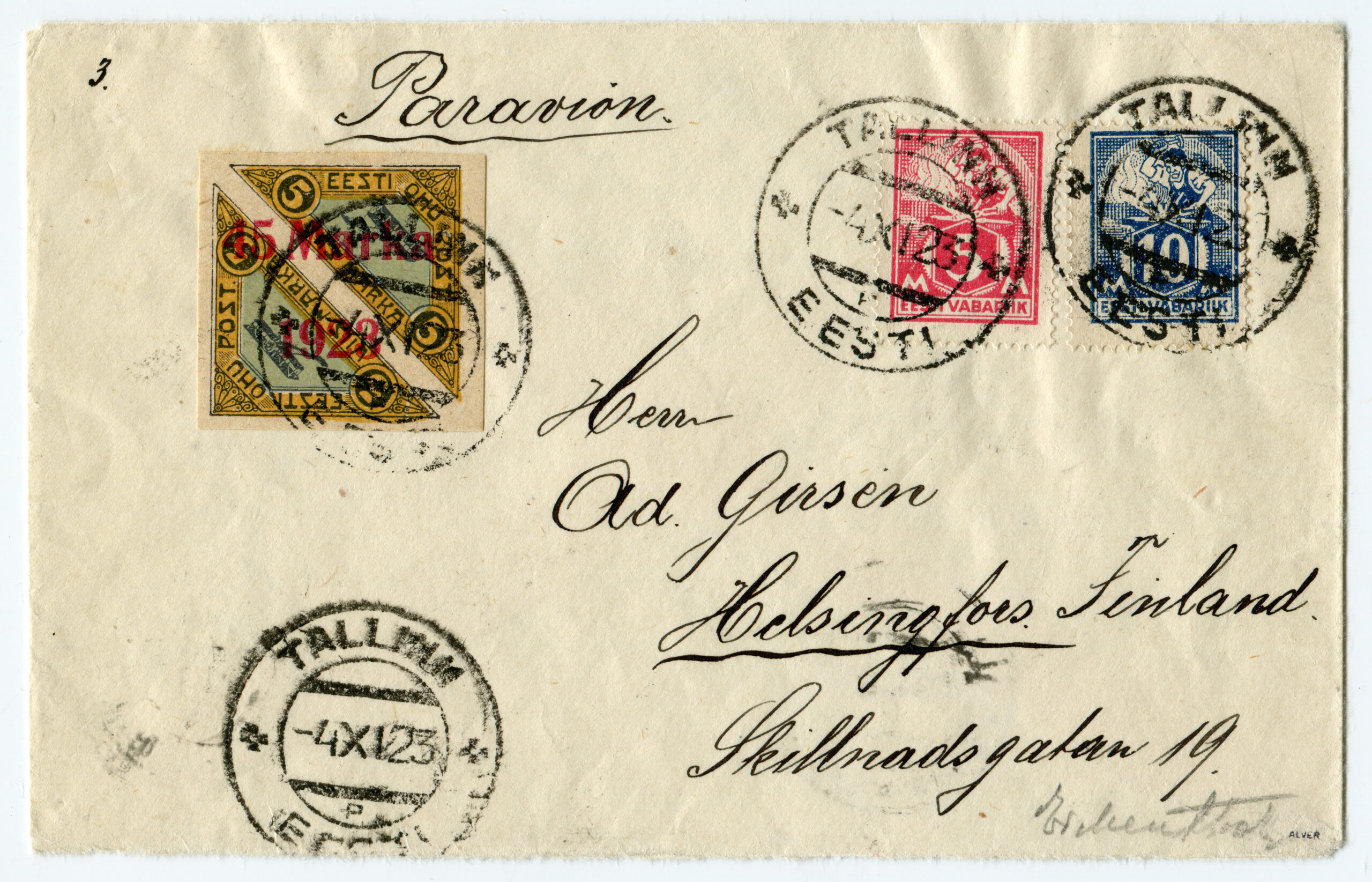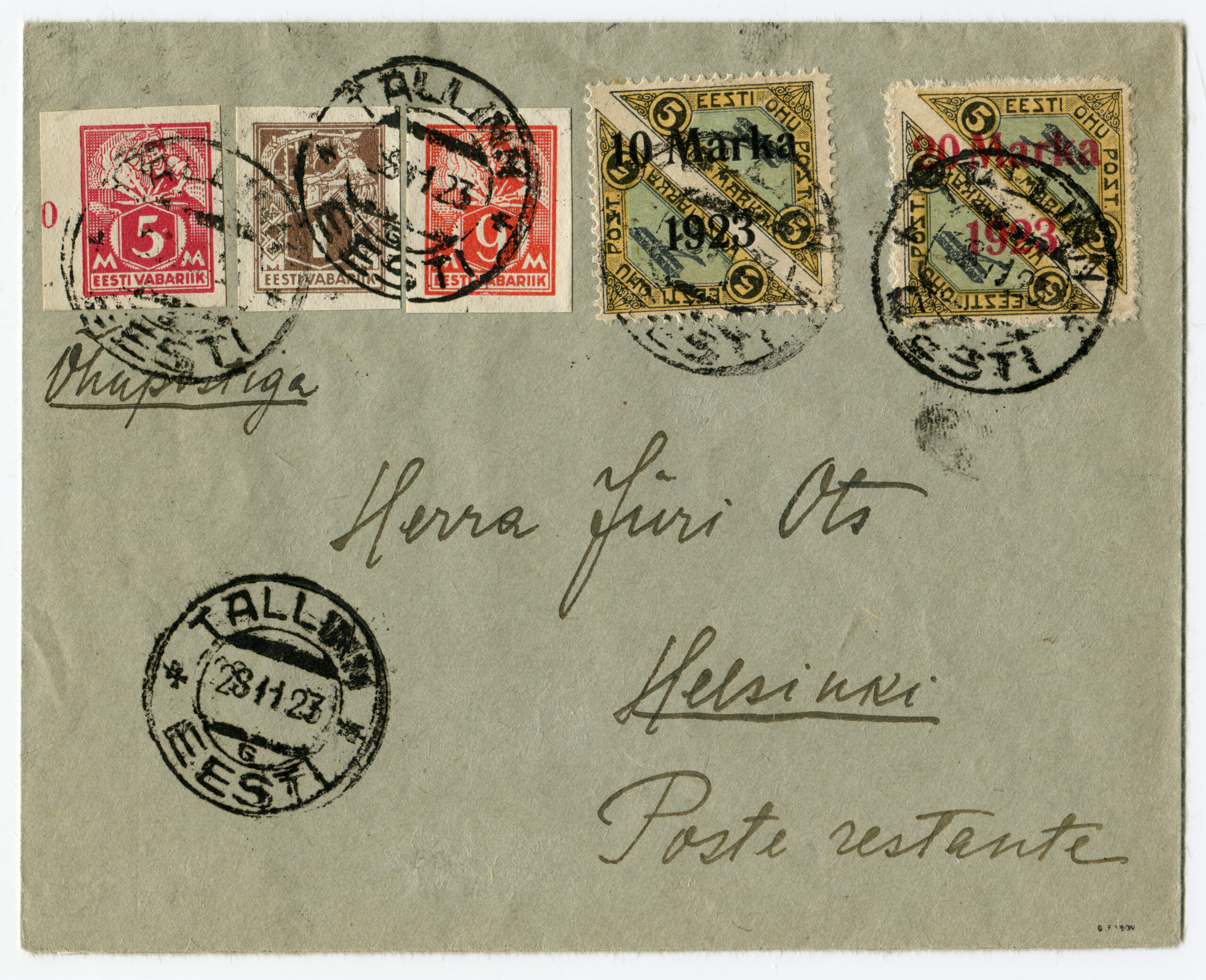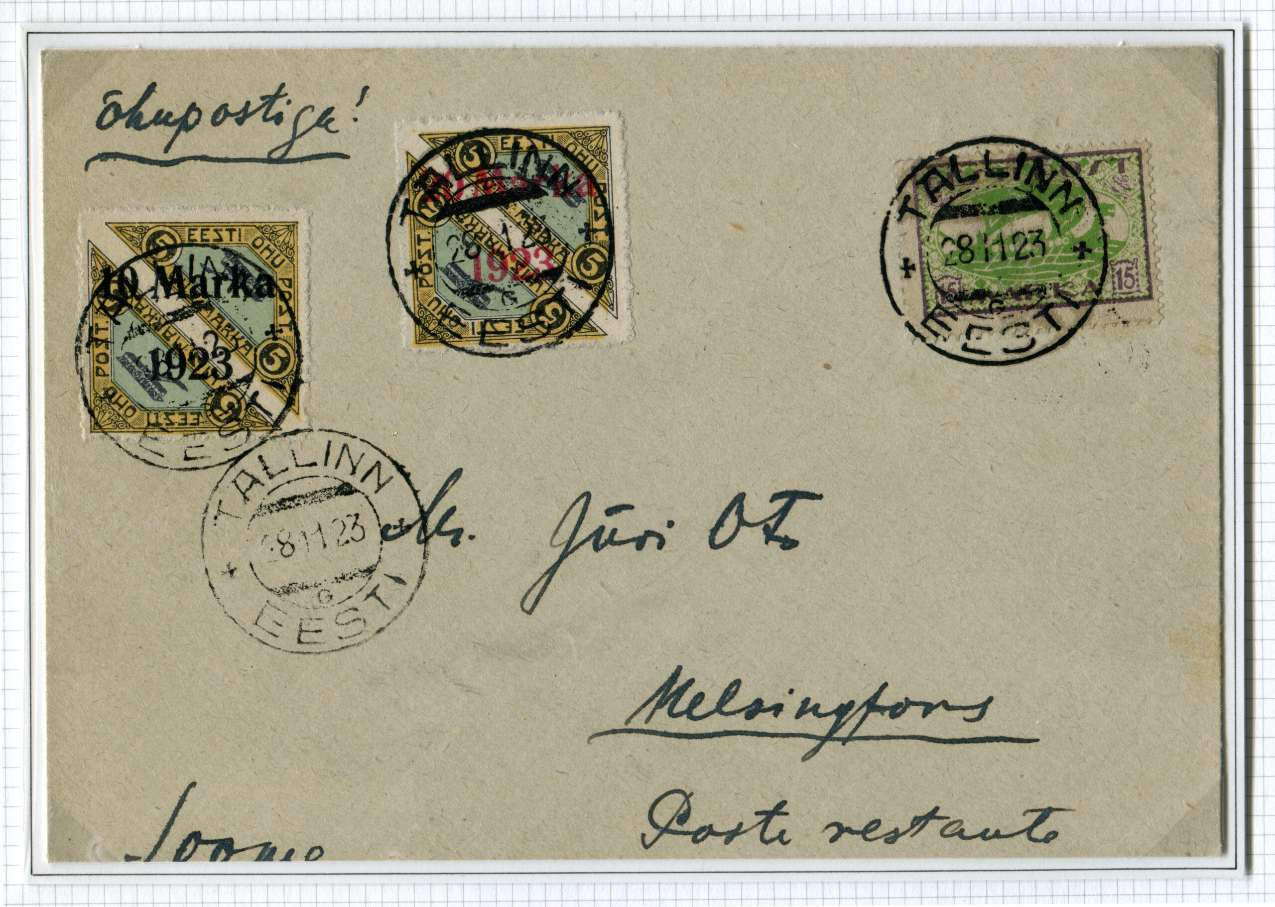 Kiri on saadetud Tallinnast 28.11.1923 Helsingisse 1.12.1923.