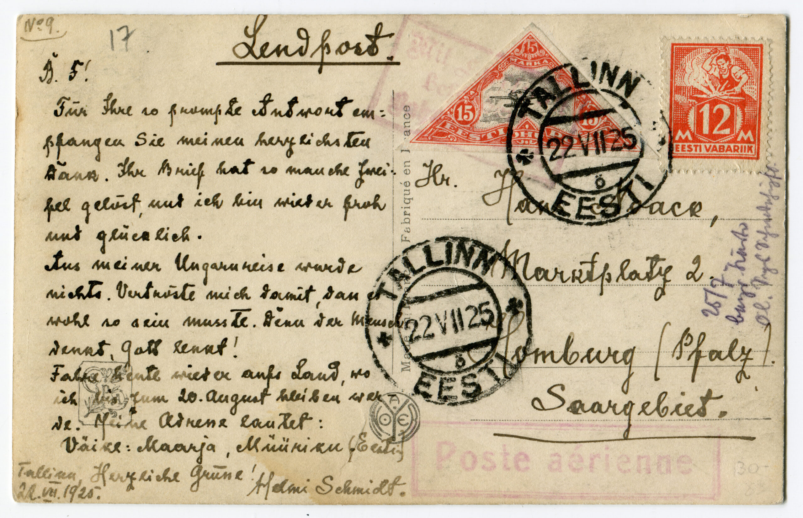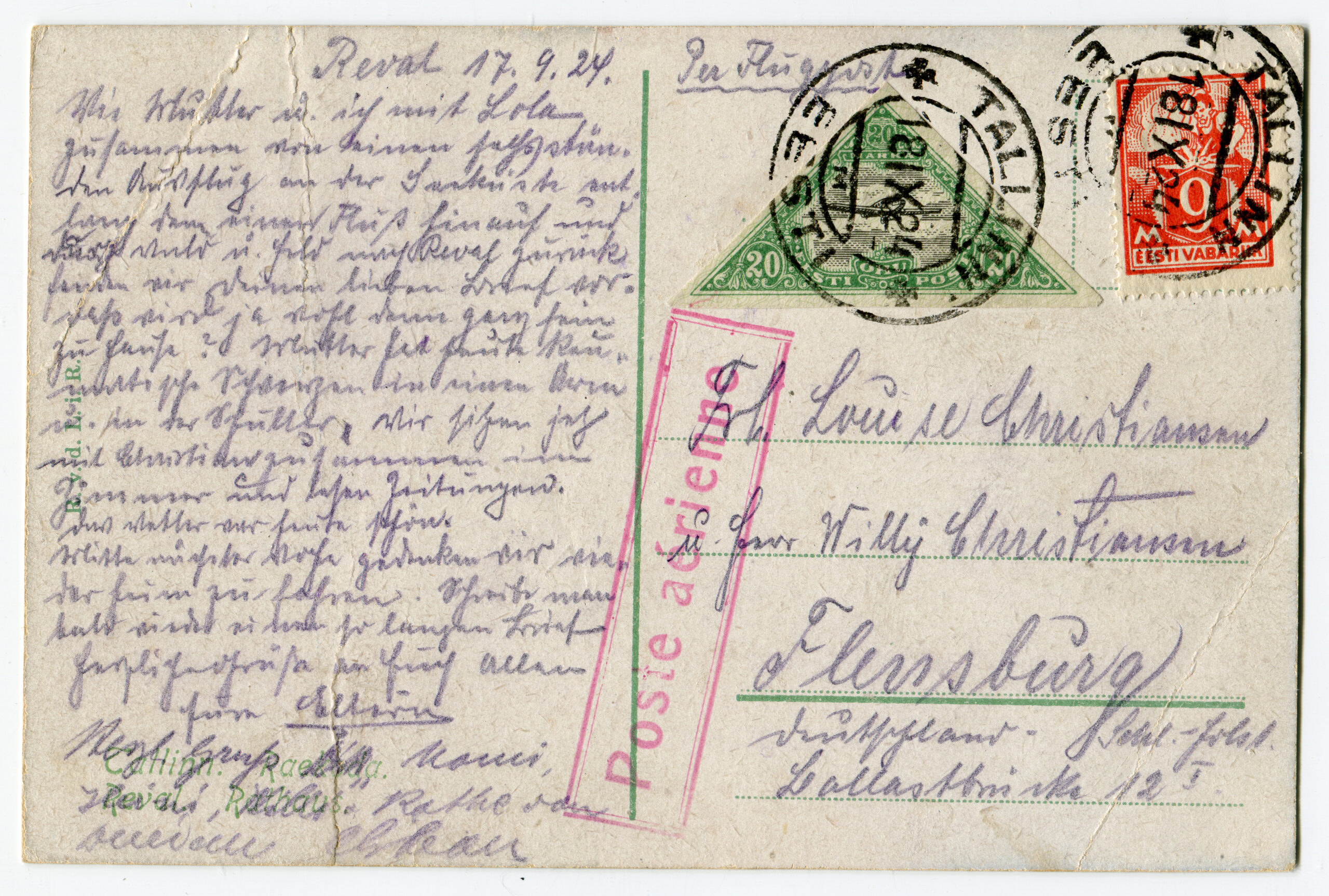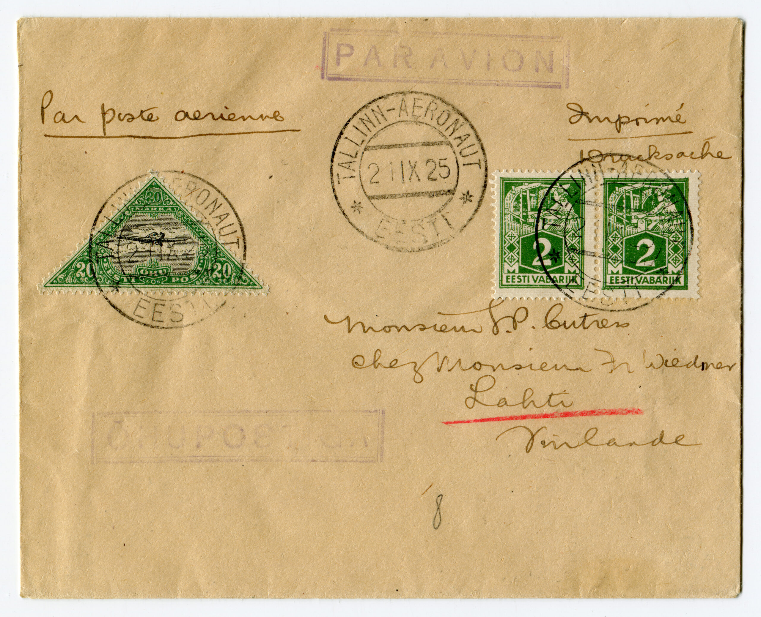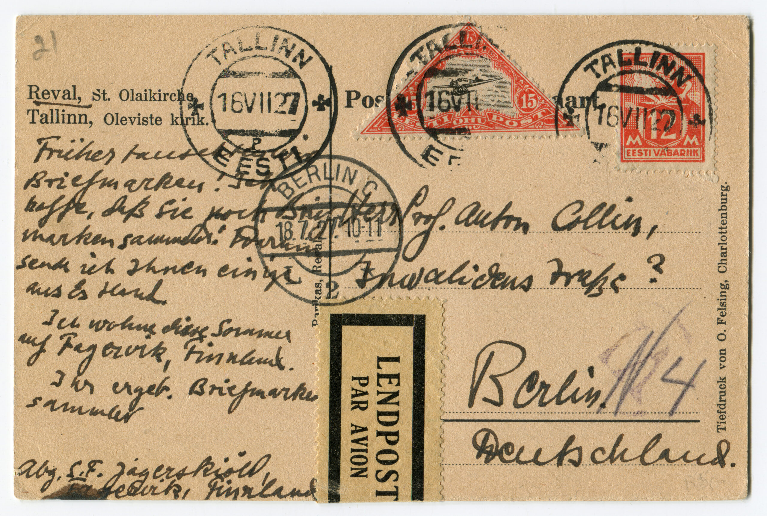 Õhupostikiri on saadetud Tallinnast 6.07.1926 Helsingisse.