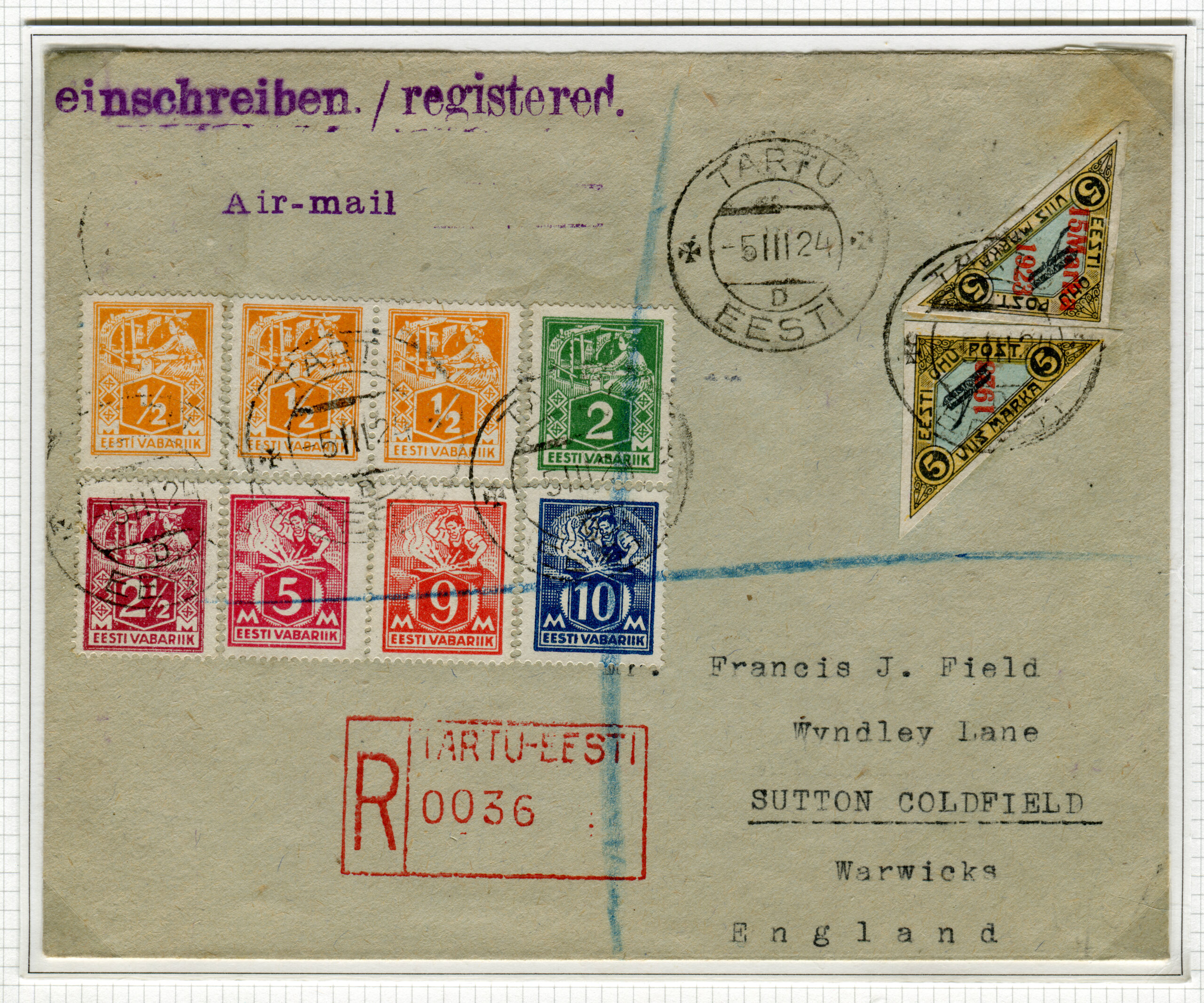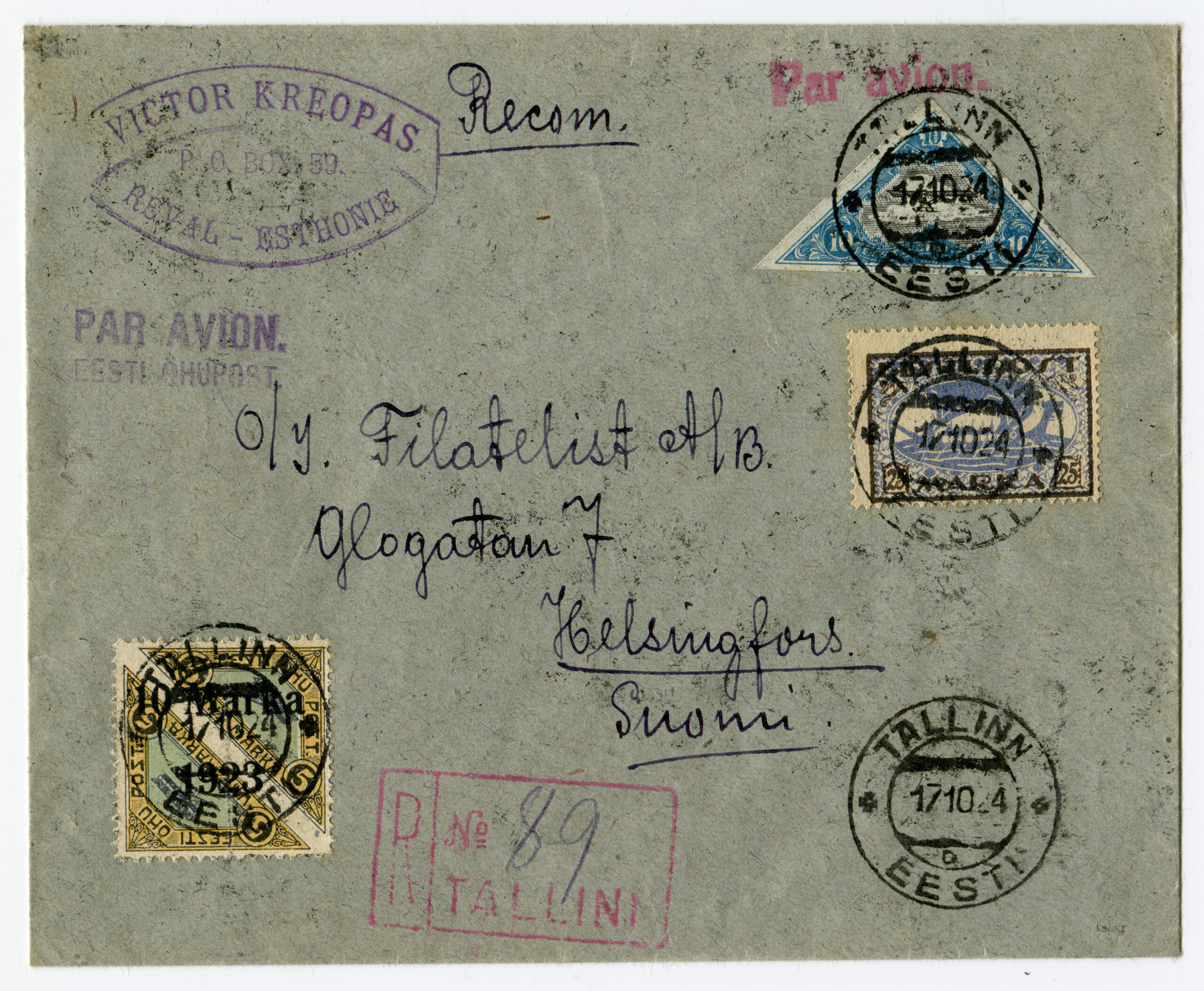 Tähitud õhupostikiri Tallinnast 17.10.1924 Helsingisse 17.10.1924.
