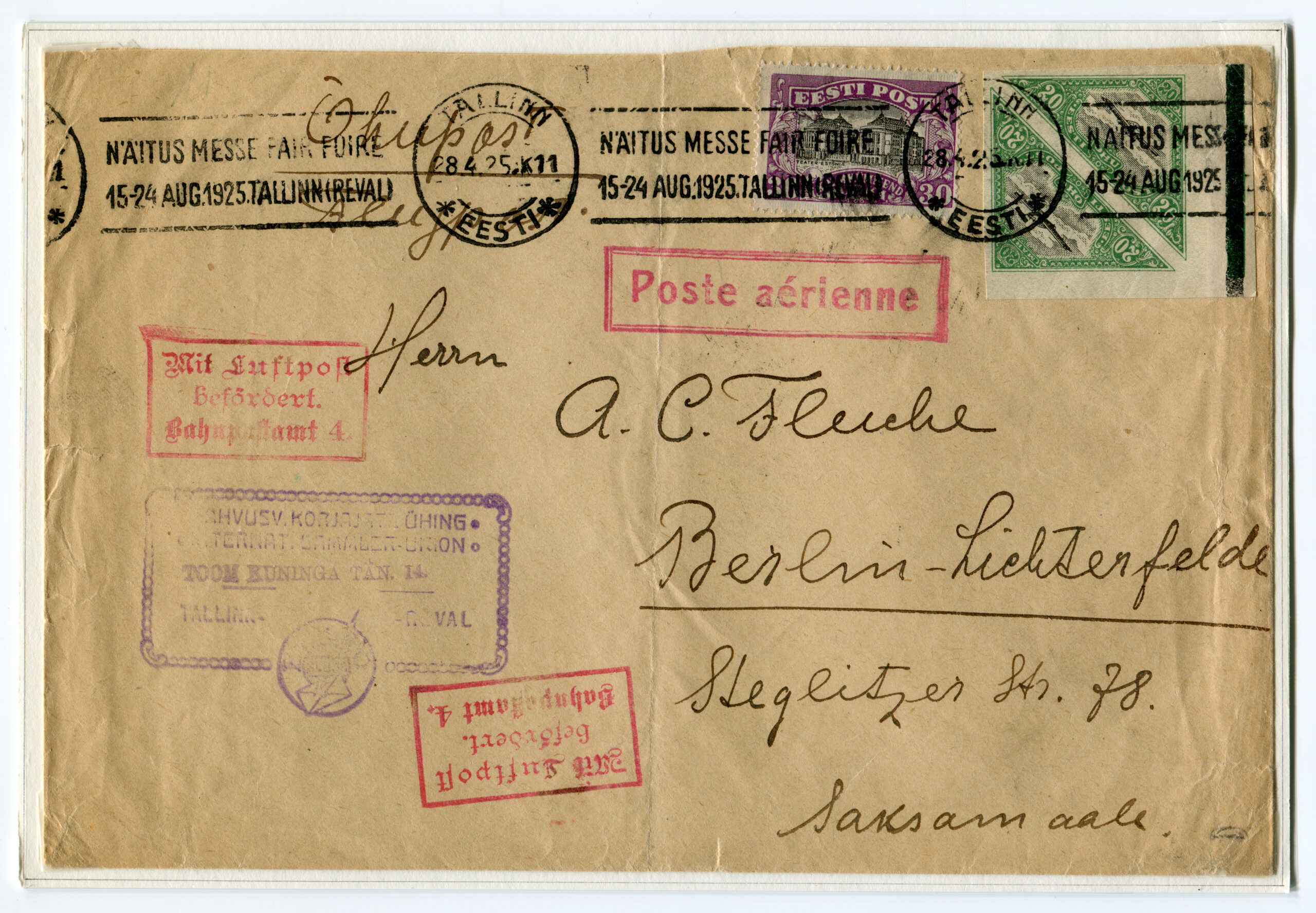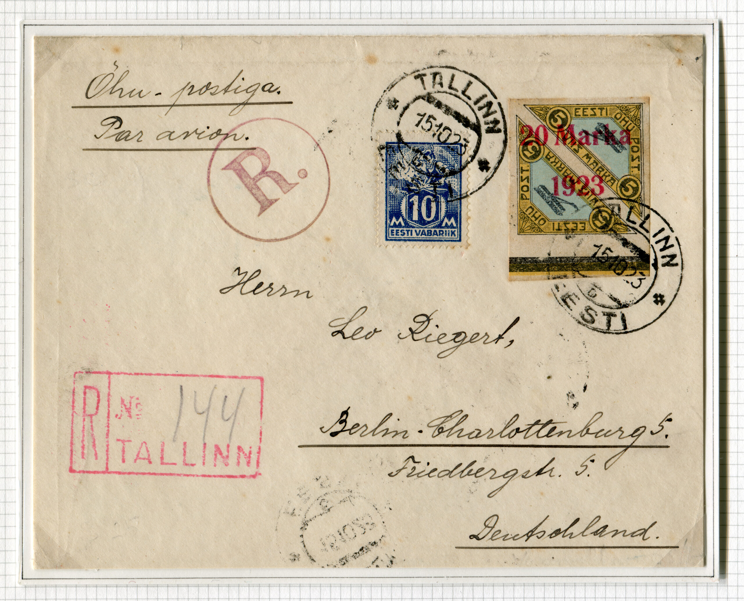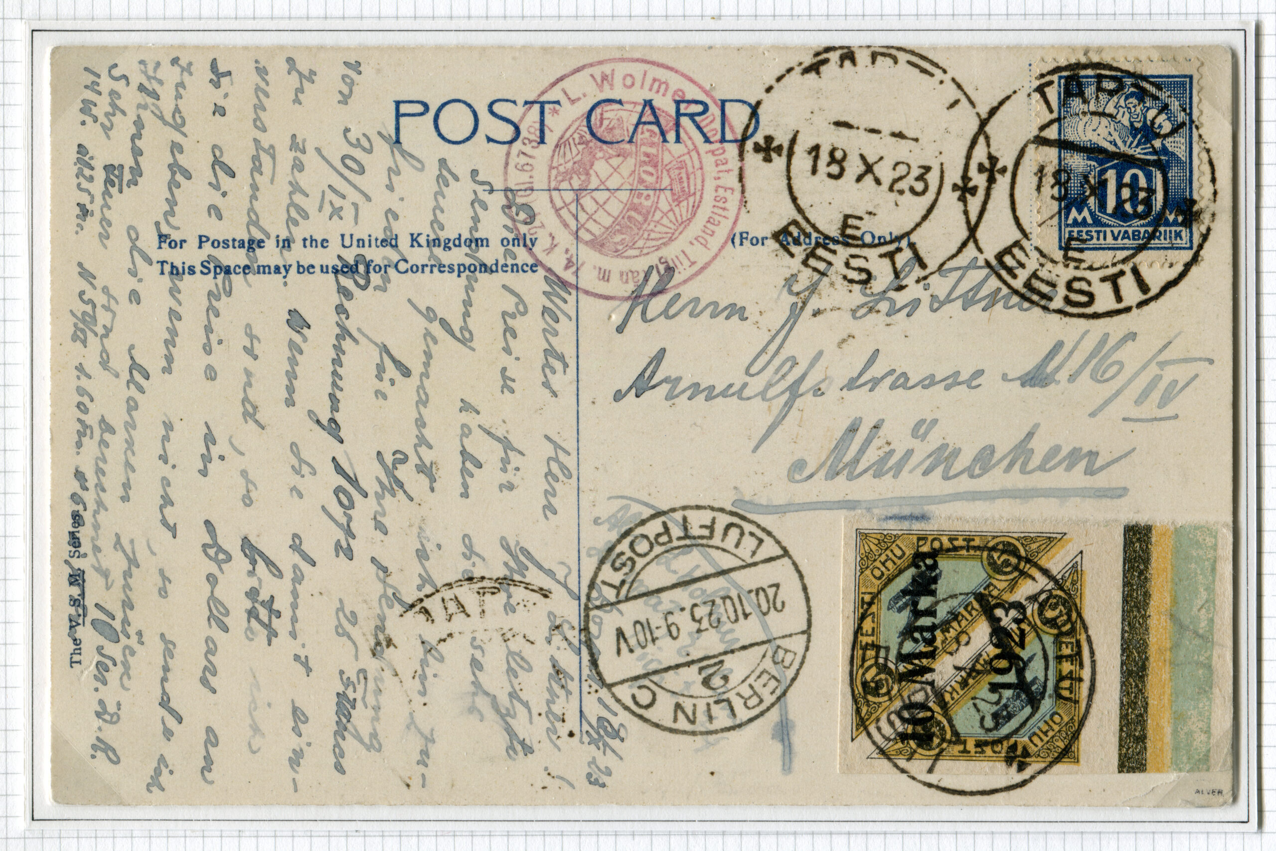 Kiri on saadetud Tartust 18.10.1923 läbi Berliini Münchenisse (Berliini õhupostitempel 20.10.1923).