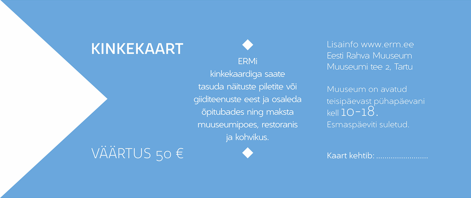 Kinkekaardiga saate tasuda näituste piletite, giiditeenuste, õpitubade eest ning maksta muuseumipoes ja restoranis.
