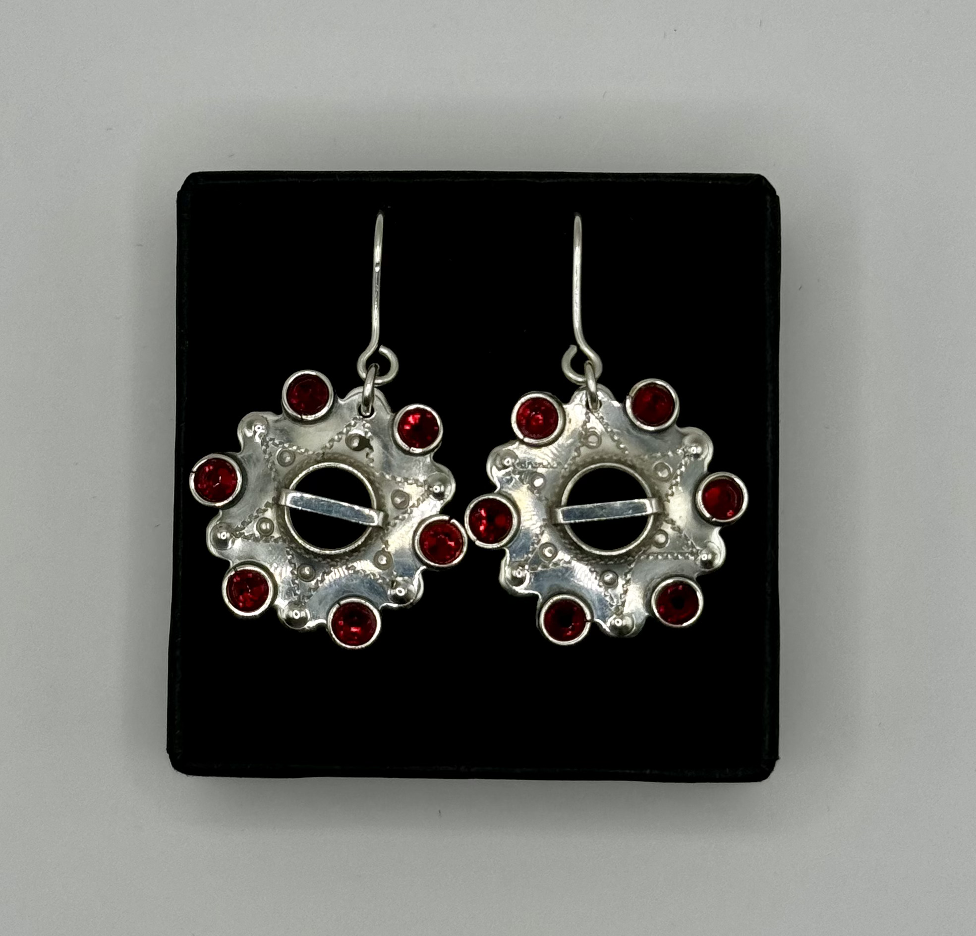 Kõrvarõngaste läbimõõt on 2,2 cm. Valmistatud hõbedast Ag 925. Kõrvarõngaste autoriks on Maria Kbejan.