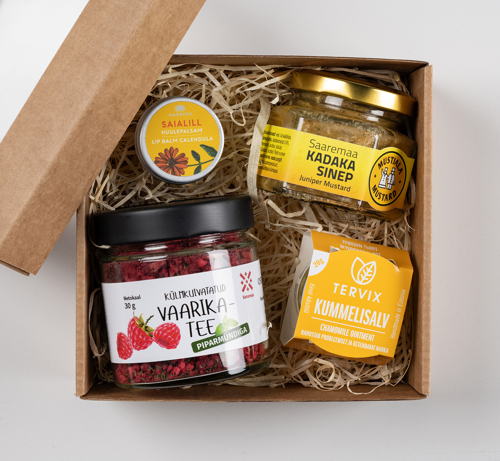 Kadakasinep, kummelisalv, saialille huulepalsam ja vaarikatee