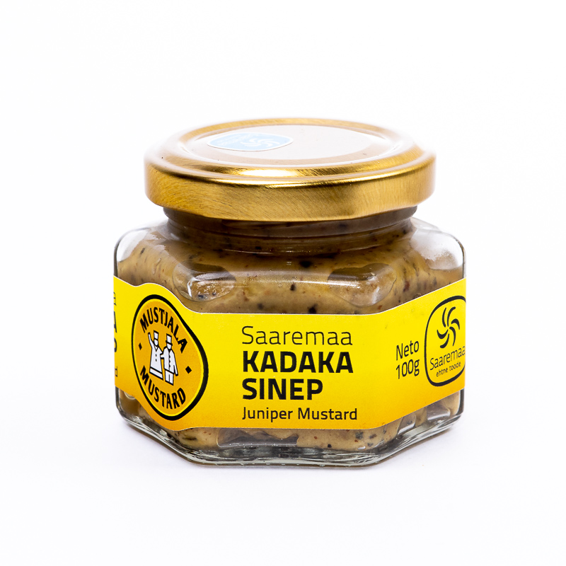 Kadakasinepi klaaspurgil on kujutatud lehvitavat Mustjala meest ja naist. Just seal, Mustjalas, Saaremaal seda sinepit ka valmistatakse, käsitsi ja peamiselt värskest toorainest ümbruskonna taludest.