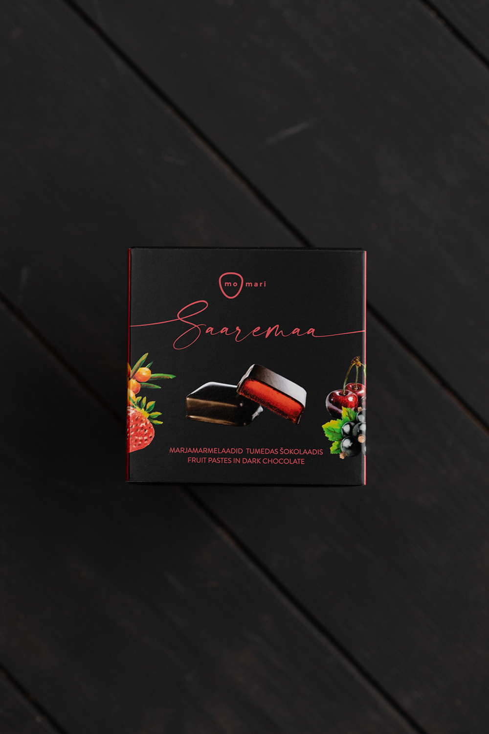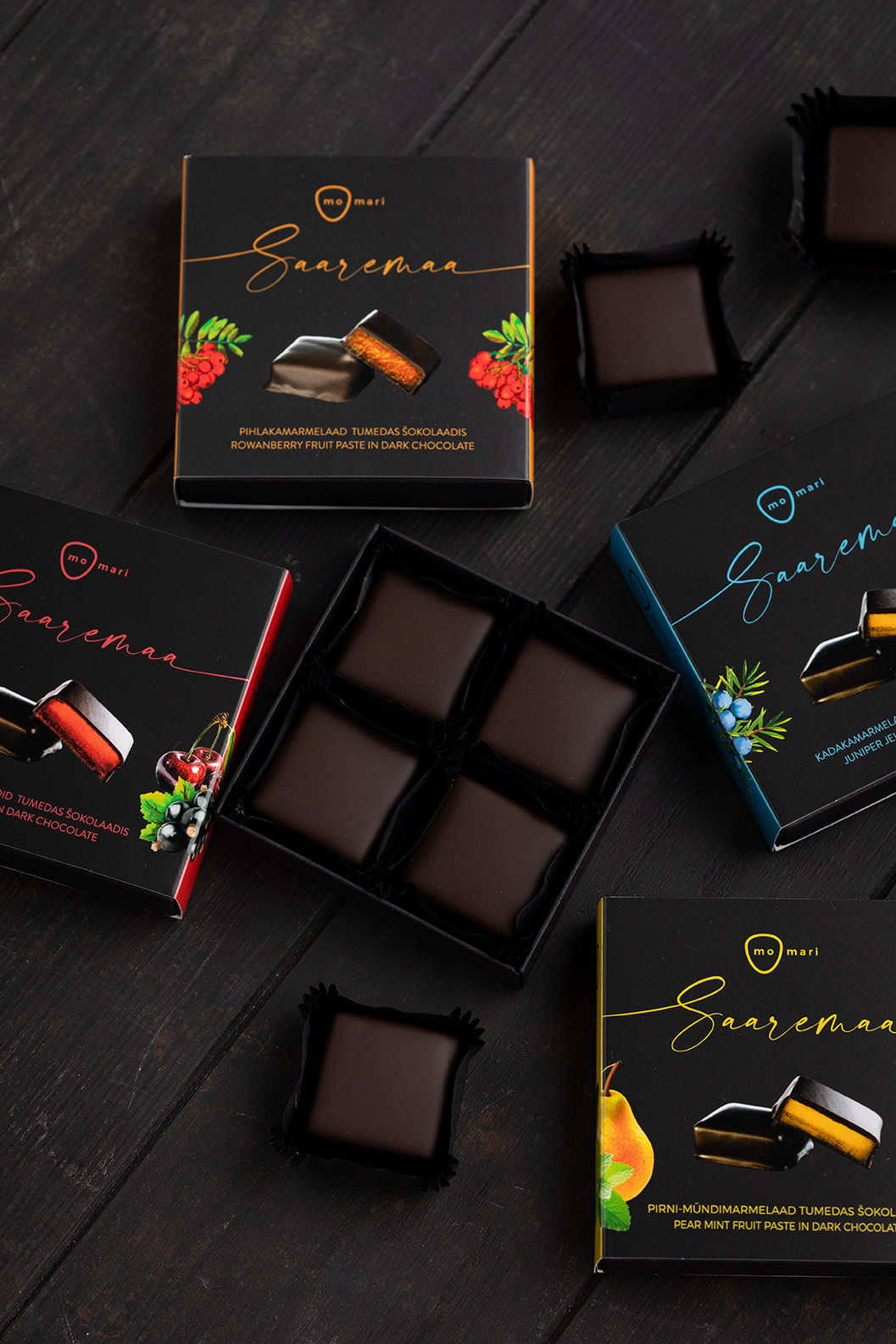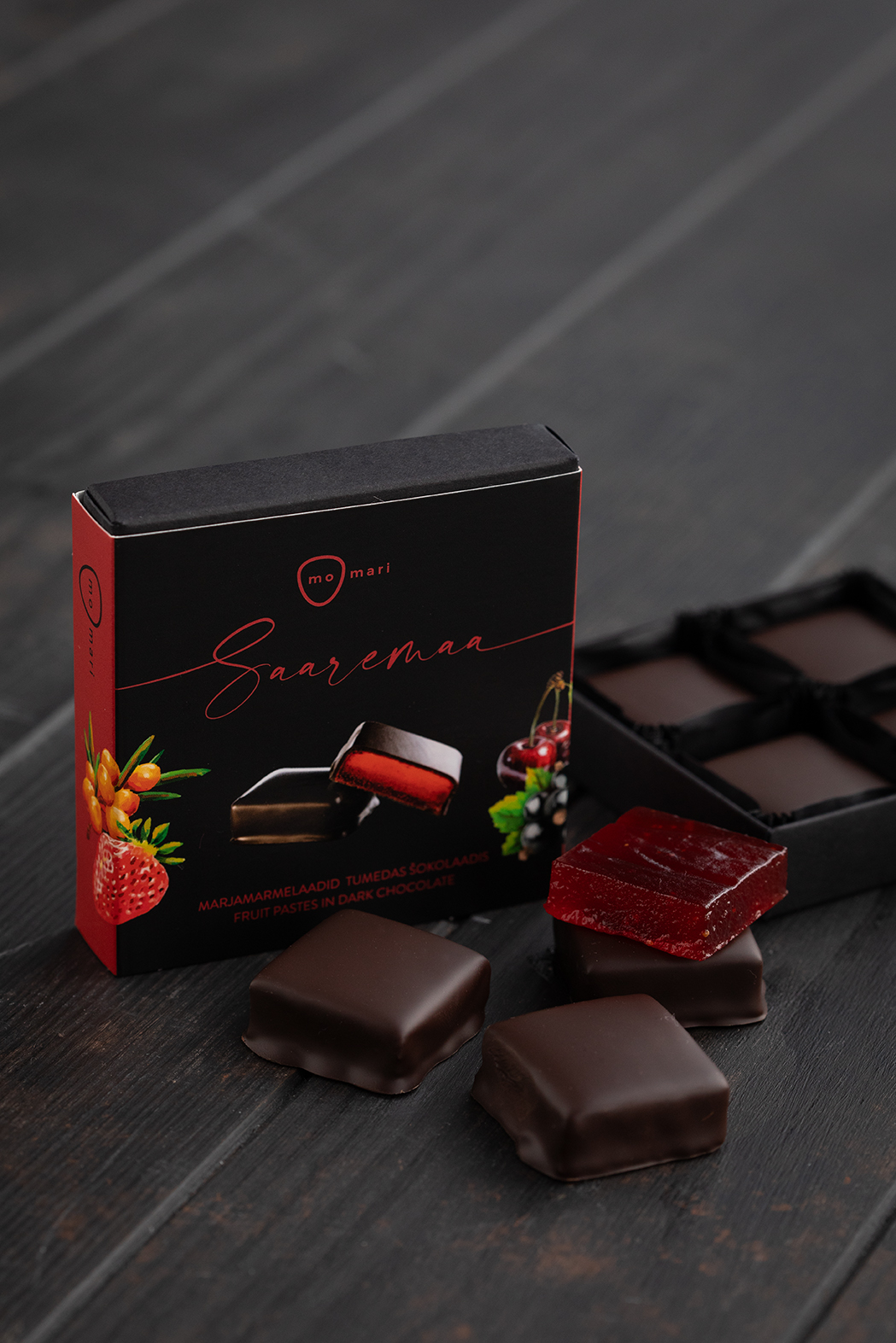 MoMari marmelaadid valmivad käsitööna puhtast marjapüreest ja on kaetud tumeda Belgia šokolaadiga.
