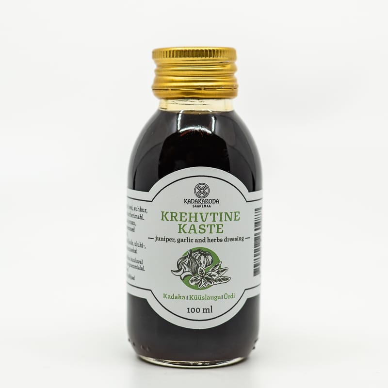 See kadakasiirup on tervete metspähklitega parajalt vedel siirup, keedetud Saaremaa kadaka võrsetest ja marjadest ning kus on heldelt sarapuupähkleid.