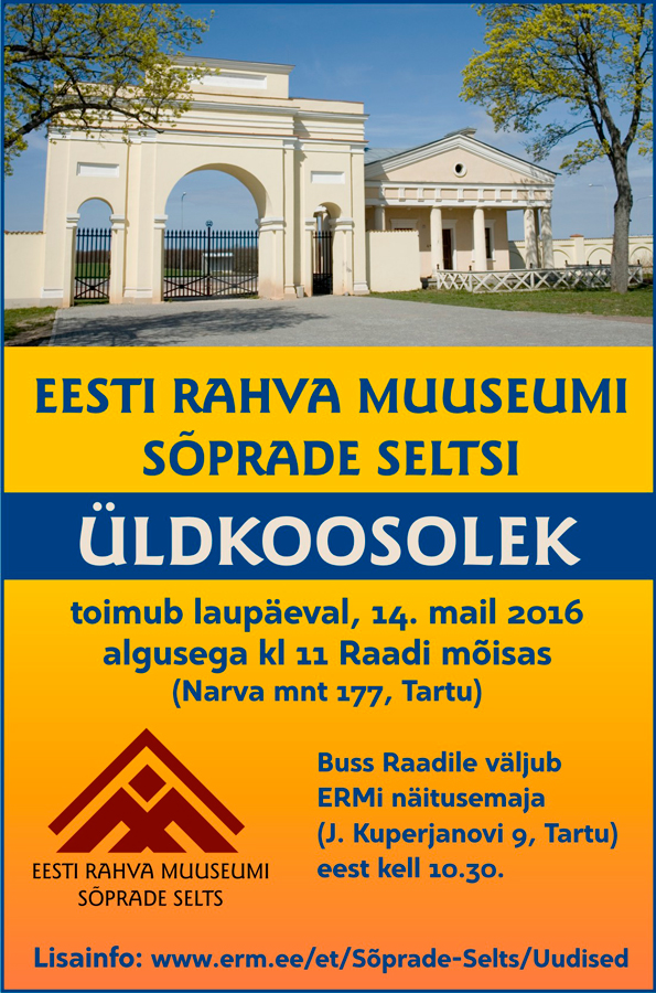 Eesti Rahva Muuseumi Sõprade Selts peab 14. mail kell 11 Raadi mõisa jääkeldri saalis üldkoosolekut.